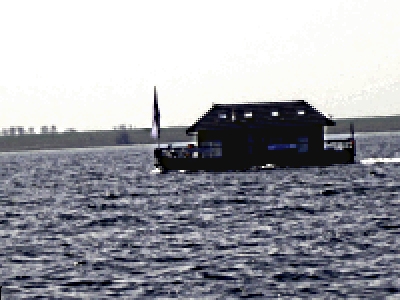 Onderweg komen we een merkwaardige boot tegen, een woonhuis op het water
